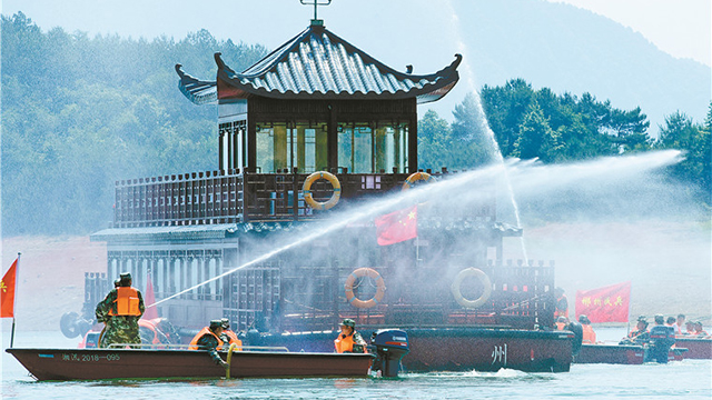 7月5日,广西壮族自治区罗城仫佬族自治县人武部联合当地民政局、防汛办,组织各乡镇专武干部、民兵应急分队,在县郊成龙湖水库展开抢险演练。
